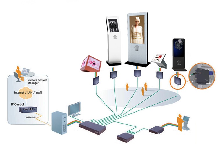 El contenido gráfico es almacenado, gestionado y programado en un servidor central vía Internet, que mantiene comunicación permanente con el sistema de pantallas y le envía automáticamente cualquier actualización que se realice.